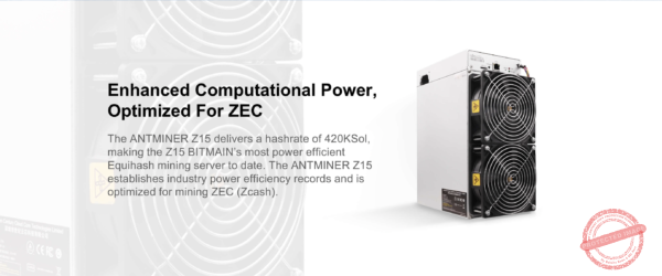 Bitmain Antminer Z15 mining Equihash algorithm with a maximum hashrate of 420 ksol/s for a power consumption of 1510W.